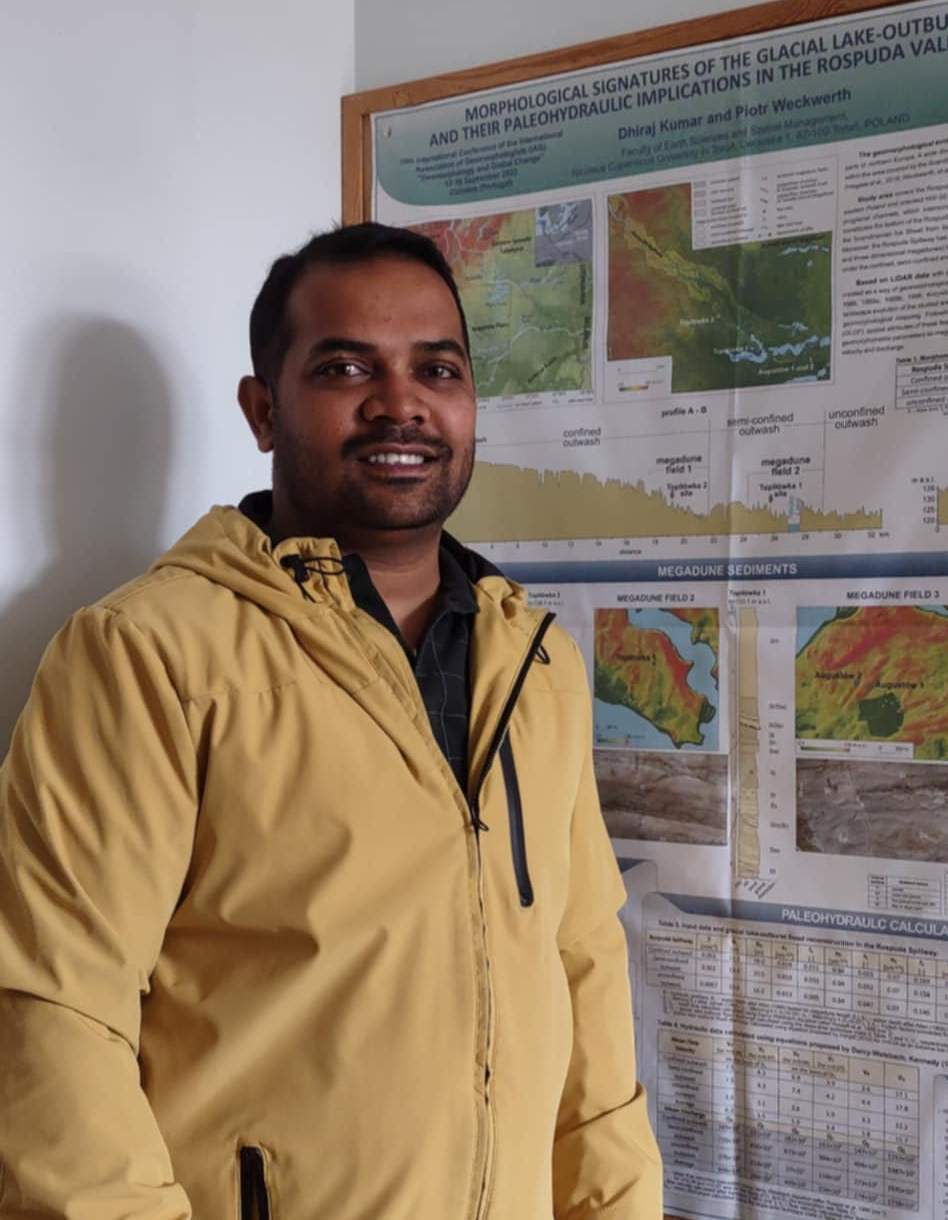 Mgr Dhiraj Kumar ukończył studia geograficzne w Indian Institute of Science Education and Research Kolkata. W ramach projektu doktorskiego prowadzi badania geomorfologiczne, których celem jest zidentyfikowanie form rzeźby terenu, które świadczą o powodziach lodowcowych w obrębie sandru doliny Rospudy i na Równinie Augustowskiej podczas ostatniego zlodowacenia, na podstawie charakterystyki ich morfologii i interpretacji budowy geologicznej. Zebrane dane mają także posłużyć do oszacowania wielkości przepływu powodzi lodowcowej i opracowania modelu rozwoju wielkoskalowych form dennych w warunkach przepływu skrępowanego wód powodzi lodowcowej. Badania naukowe prowadzone przez mgra Dhiraja Kumara realizowane były w ramach projektu badawczego (jako wykonawca-stypendysta), finansowanego przez Narodowego Centrum Nauki, pt. „Dowody geomorfologiczne i implikacje paleogeograficzne katastrofalnych powodzi i szarży lodowcowych południowego sektora lądolodu skandynawskiego w późnym vistulianie(MEASSIS)” (projekt nr 2018/31/B/ST10/00976). Mgr Dhiraj Kumar jest współautorem jednego artykułu naukowego indeksowanego na Web of Science.