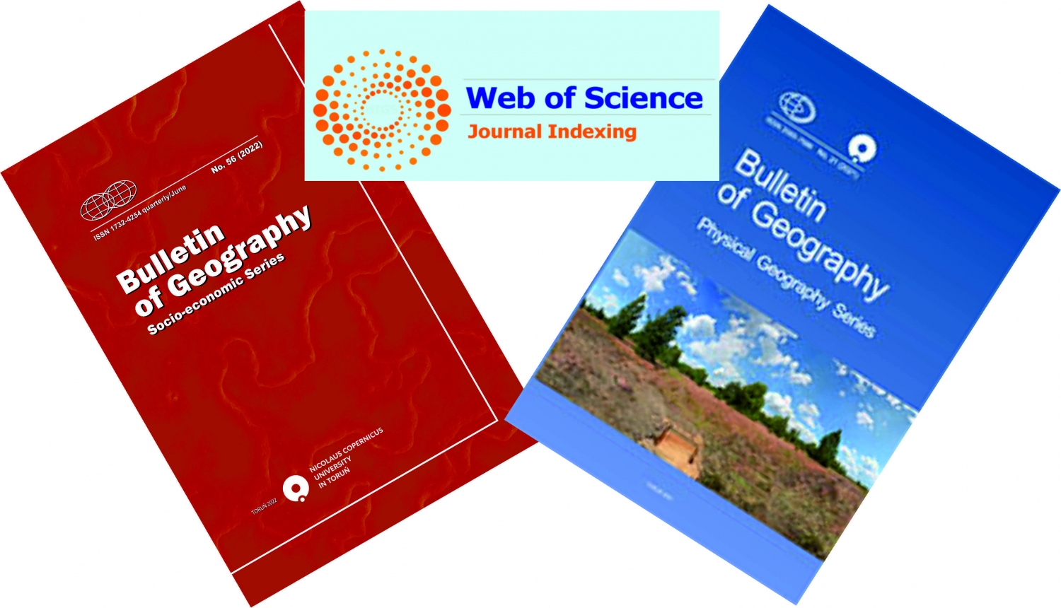 BULLETIN OF GEOGRAPHY-SOCIO-ECONOMIC SERIES. Wskaźniki: Web of Science - Clarivate Analytics (Journal Impact Factor 2022 = 1.1, Five Year = 1.2). Strona www: https://apcz.umk.pl/BGSS/about/editorialTeam. Pozostałe parametry bibliometryczne czasopisma: 2022 Journal Citation Indicator = 0,44, Scopus h-index: 23.