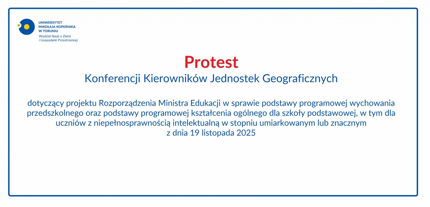 Szanowni Państwo! Ze względu na sytuację dotyczącą projektu Rozporządzenia Ministra Edukacji w sprawie podstawy programowej wychowania przedszkolnego oraz podstawy programowej kształcenia ogólnego dla szkoły podstawowej, w tym dla uczniów z niepełnosprawnością intelektualną w stopniu umiarkowanym lub znacznym z dnia 19 listopada 2025 publikujemy treść protestu Konferencji Kierowników Jednostek Geograficznych z 21 listopada br.