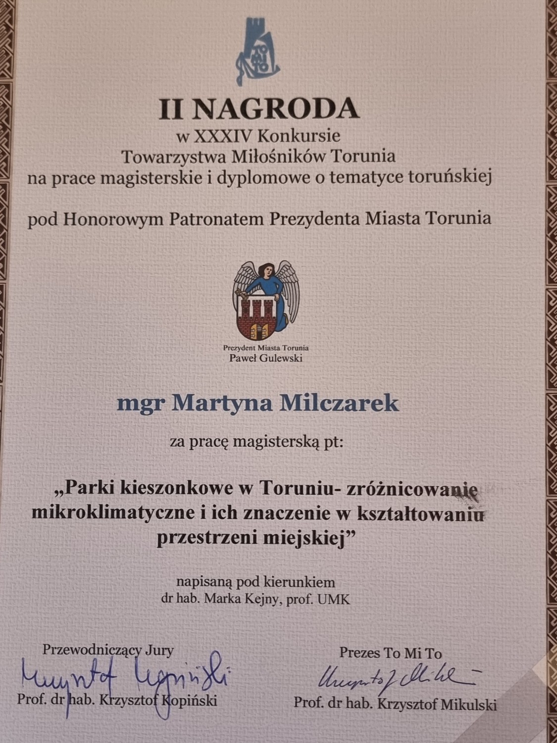 mgr Martyna Milczarek (absolwentka studiów Gospodarka Przestrzenna i Geozarządzanie) - nagroda II stopnia za pracę magisterską „Parki kieszonkowe w Toruniu – zróżnicowanie mikroklimatyczne i ich znaczenie w kształtowaniu przestrzeni miejskiej”, napisaną pod kierunkiem dr. hab. Marka Kejny, prof. UMK