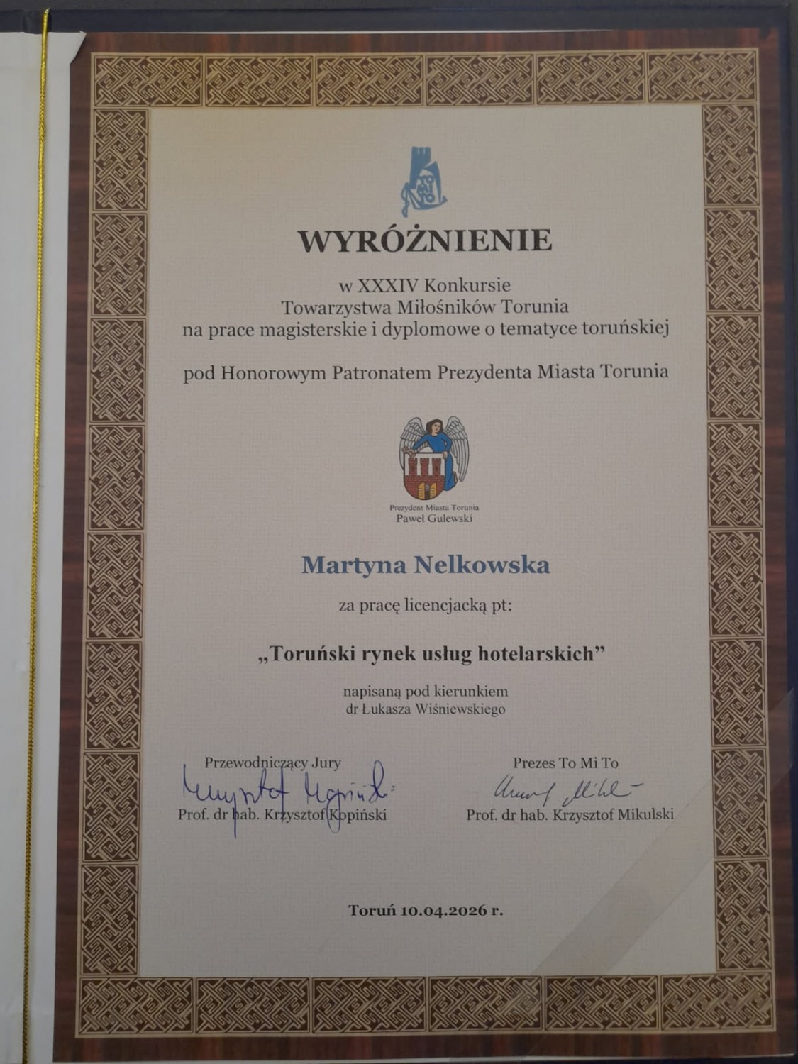lic. Martyna Nelkowska (absolwentka studiów Turystyka i Rekreacja) – wyróżnienie za pracę licencjacką „Toruński rynek usług hotelarskich”, napisaną pod kierunkiem dr Łukasza Wiśniewskiego.